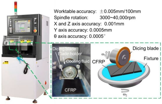 Basically, the quality of kerf depends on the combination of the material being worked upon and the parameters of the cutting process, cooling system, feed speed, type of blade, and peripheral speed [47]. However, for the ultraprecision dicing of CFRP composites, the failure mechanism is more complex than hard and brittle materials because of its heterogeneity, anisotropy of mechanical properties, and low thermal conductivity. Therefore, the comprehensive factors that affect cutting damage should be investigated. As shown in Figure 1, the dicing machine has an accuracy as small as 1 μm. A CFRP laminate was fixed on a ceramic sucker so that it undergoes uniform load when it is chucked.
