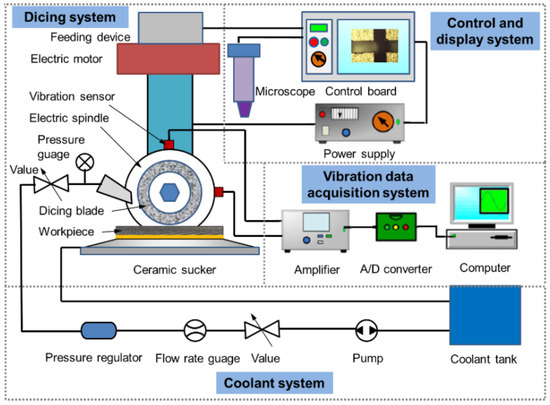 As illustrated in Figure 2, the control and display system in the machine was used to locate and observe the cutting kerf. It is easy to calculate the wear amount of the dicing blade by twice tool setting before and after the dicing process. Due to the sensitivity of CFRP composites to machining temperature, the dicing blade and cutting region of the workpiece were cooled by the coolant system during the dicing process. Hereby, deionized water was used as coolant. Furthermore, the vibration of the spindle has an important influence on the micro-cutting damage of CFRP composites, so a vibration data acquisition system was fixed onto the dicing machine. Two vibration sensors were adhered onto the surface of spindle with an angle of 90° to perceive the vertical and horizontal vibrations of the spindle. Because it is difficult to fix a dynamometer onto the cutting machine, the cutting current was measured to reflect the variation of the cutting force.