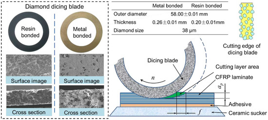 As the cutting tool, the dicing blade has a remarkable influence on the cutting quality. Its preparation method is a key factor for machining performance. The complex preparation process of the dicing blade includes mixing powders, filling powders into the graphite die, sintering powders, reducing thickness, and dressing the shape. According to the different matrices in the dicing blade, the precision dicing blades are divided into three types: metal-sintered diamond blades, resin-bonded diamond blades, and electroplated nickel bond diamond blades. Metal-sintered diamond blades have a higher blade lifetime due to the higher thermal conductivity and better mechanical properties of the binder material. Resin-bonded diamond blades are used in applications that require a smooth surface finish and a minimum amount of chipping. Electroplated nickel bond diamond blades have a high diamond concentration and give a freer, faster cutting action with minimum heat generation. In these cutting experiments, two types of diamond dicing blade, including metal-bonded dicing blade and resin-bonded dicing blade, were used for cutting CFRP composites. The thicknesses of the two types of dicing blades were 0.26 ± 0.01 mm and 0.20 ± 0.01 mm, respectively. The diamond size of dicing blades was about 38 μm, which is much smaller than most of the electroplated diamond tools used for drilling CFRP laminates. The cross-section structure and the diamond abrasive distribution of the used dicing blades are shown in Figure 3. It can be seen that the diamond abrasives distribute uniformly in the blade matrix and has a sharp edge. If the diamond abrasives in the blade surface wear, they will fall off the blade under the action of cutting force, which is larger than the bonding force of diamond grits with the matrix. Thus, the diamond blades have better self-sharpening properties in comparison with PCD (polycrystalline diamond) tools or diamond-coated cemented carbide tools. The cutting layer area is also much smaller than that of traditional grinding. Thus, the diamond dicing blade may generate a much smaller cutting force than traditional methods, which can result in small or free machining damage for CFRP laminates.