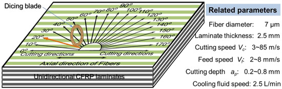 Diamond blades, created by embedding diamond particles in a metal matrix or brazing diamond particle onto the borders of a steel core, can increase significantly the life of cutting tools, especially for high-speed machining hard-to-cut materials. It was first widely designed to cut hard or abrasive materials, such as concrete, marble, stone, and ceramics, when its thickness and the size of diamond particles are large [40,41,42]. Then, ultra-thin and high-precision diamond blades are developed to use in slicing, dicing wafer, cut-off, singulation, grooving, slotting, cross sectioning, sample preparation, gang sawing, slabbing, and fine cutting applications. As one of the most common methods for precision cutting, bladed dicing is characterized by using abrasive thin blades as the cutting element [43,44]. The dicing blade is fixed on a high-speed spindle normally supported by aerostatic or ceramic bearings. The blade can reach up to 60,000 rpm and a blade with a diameter of 51 mm would reach a peripheral cutting speed at about 160 m/s. Thus, a high cutting speed and the well-wearing resistance of diamond abrasives are an effective way to reduce the machining damage of nature fiber composites and CFRP composites [45,46]. Therefore, diamond dicing blades are novel to use in the micro cutting of CFRP composites, especially with micron-sized or submicron-sized machining damage and surface roughness.