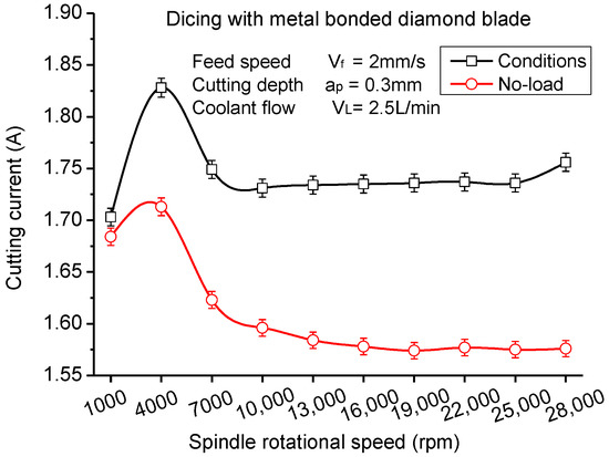 Just like other nature fiber composites with heterogeneous and anisotropic properties, the cutting quality of CFRP composites is also very sensitive to the cutting speed. In low cutting speeds, the fibers embedded in the matrix are easy to bend so as to cause large machining damage, such as delamination and debonding [46]. High machining speeds over 40 m/s can generate good surface quality for wood and other fiber reinforced composites [48]. In this study, the cutting current of the spindle and surface roughness are observed to characterize the influence of cutting speed. Many studies on the relation between the cutting force and the motor current [49] proved that the change of spindle motor current value reflects the cutting force well, and cutting force obtained by measuring the spindle motor current is reasonable and feasible. Due to the limited working space in the dicing machine, it is difficult to place a dynamometer onto the worktable to detect the cutting force. Thus, in this experiment, the cutting current obtained from the spindle motor was employed to study the change of cutting force with different cutting conditions. As illustrated in Figure 5, the cutting current of the spindle motor first increased with the rotational speed of the spindle and then decreased under the condition of no-load. The cutting current under the cutting condition has a similar trend of that of no-load. The difference is that there is an obvious increase when the spindle rotational speed changes from 25,000 to 28,000 rpm under the cutting condition. It indicates that under rotational speeds higher than 25,000 rpm, the cutting resistance increases enormously. High cutting current in the rotational speed of 4000 rpm attributes to the self-excited chatter vibrations of the spindle. Under the condition of low rotational speeds, the cutting layer area is larger than that of high rotational speeds. Cutting force and cutting current therefore increases in low rotational speeds.
