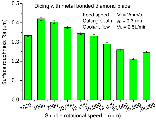 As presented in Figure 6, the surface roughness of machined CFRP laminates appears to have the same tendency as the cutting current, which illustrates that there is a significant correlation between cutting current and surface roughness. According to previous studies, the cutting current can reflect the cutting force reasonably. Thus, small cutting forces will generate lower surface roughness. It can conclude that CFRP laminates present the best cutting quality at the rotationl speed of 25,000 rpm where the spindle motor runs steadily. Too high rotational speeds of the spindle are not beneficial in improving the dicing quality of CFRP laminates. Meanwhile, the deformation of the dicing blade and vibration of the spindle in low rotational speeds increases the surface roughness of CFRP laminates.