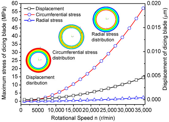 Maximum stress and displacement of the dicing blade with different rotational speed.