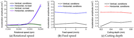 The main mechanisms generating excessive cutting tool vibration can be classified into three types: regenerative, mode coupling, and velocity-dependent [50]. Velocity-dependent mainly originates from the self-excited chatter vibrations of spindle. When the rotational speed is about 4000 rpm, the resonance of the spindle drives the large vibration of the cutting tool, which therefore results in large cutting surface roughness. The regenerative vibration has a simple relationship between the cutting force coefficient, dynamic stiffness of the structure, spindle speed, and depth of cut [51]. The vibration stability has been attributed to either the change in the direction of cutting speed or the cutting force between the cutting tool and the finished workpiece. During the cutting process with the dicing blade, the cutting speed is located in the direction normal to the axis of the spindle. Furthermore, the cutting force can be divided into two component forces in vertical and horizontal directions. Thus, the vibrations in the vertical and horizontal directions are obvious. When the rotational speed increases to 28,000 rpm from 25,000 rpm, the vibration in the horizontal direction has a significant increase, as shown in Figure 8. It demonstrates that the large surface roughness and cutting current is mainly caused by the vibration in the horizontal direction. The vibration of the spindle in the vertical direction is small due to the weight of the spindle and the load shift in the stiffness of the spindle in the vertical direction. Besides, the change of the cutting force in the horizontal direction due to the heterogeneity between the fiber and resin matrix can also be attributed to the large vibration. Other cutting parameters, such as feed speed and cutting depth, have a small effect on the vibration amplitude of the spindle. As shown in Figure 8c, there is a slight increase of vibration amplitude in the vertical direction when the cutting depth changes from 0.2 to 0.8 mm, while the vibration amplitude of the spindle in the horizontal direction keeps a steady change varying with the cutting parameters.