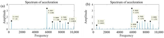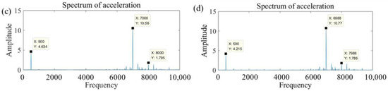 Vibration acceleration spectrum diagram with different conditions in frequency domain. (a) With a rotational speed of 25,000 rpm and no-load condition; (b) with a rotational speed of 25,000 rpm and conditions, (c) with a rotational speed of 30,000 rpm and no-load condition; (d) with a rotational speed of 30,000 rpm and conditions.