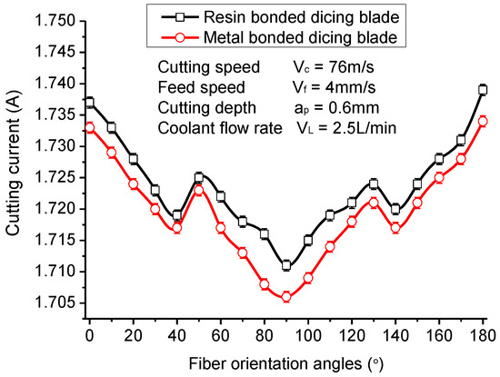 The fiber orientations have remarkable influence on the cutting current and surface quality due to the outstanding anisotropy of CFRP laminates. Figure 10 shows the maximum cutting current of the spindle motor when different fiber orientation laminates are cut with the resin-bonded dicing blade and the metal-bonded dicing blade. It can be noted that the cutting current of the spindle motor with the metal-bonded dicing blade are overall smaller than that of with the resin-bonded dicing blade, which is different from the cutting of regular brittle materials, such as glass. When cutting brittle materials, the cutting force with a resin-bonded blade is usually smaller than the metal-bonded blade due to the small bonding force of diamond grits with resin matrix. For cutting CFRP composites in this experiment, the poor thermal conductivity of the resin-bonded blade and the CFRP workpiece led to the increase in cutting temperature and the softening of the resin, which results in shifting the cutting force. Therefore, the large cutting force generates a larger cutting current with the resin-bonded blade and causes more serious wear to the dicing blade. It can be verified by the results of the cutting experiments. The wear amounts of the resin-bonded blade in the diameter direction is about 0.17 mm per cutting 10 m, while the wear amounts of the metal-bonded blade is about 0.13 mm per cutting 10 m.