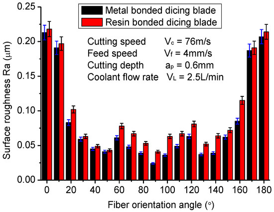 (2) The cutting currents of the spindle motor present an overall V-shape tendency when the fiber orientation angle changes from 0° to 180° due to the mechanical anisotropy of CFRP composites. The maximum value occurs at the fiber orientation of 0°, while the minimum value occurs at the fiber orientation of 90°. With the fiber orientation changing from 0° to 90°, the cutting current presents an overall decrease but a slight increase at about 40°. This tendency is different from most reported research about the milling and drilling of CFRP composites. It may be attributed to the different cutting mechanism of the dicing method with drilling and milling methods. The surface roughness of machined CFRP composites has a similar tendency with the cutting current. When the cutting direction is perpendicular to the fiber orientation, the machined CFRP composite obtains the best surface finish at about Ra 0.025 μm, which is lower than most reported results. Furthermore, the metal-bonded dicing blade achieves smaller surface roughness than the resin-bonded dicing blade when cutting with all fiber orientations due to its good thermal conductivity and low friction coefficient.