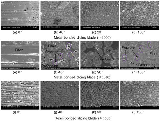 In order to address the reason of the above tendency of surface roughness, surface morphologies of diced CFRP composites with different fiber orientations are investigated, as shown in Figure 12. As can be seen from the figures, the surface qualities of diced CFRP composites with the metal-bonded dicing blade are better than that of the resin-bonded dicing blade. According to the observations of cutting morphologies, one of main reasons causing large surface roughness with the resin-bonded dicing blade is that there is some molten resin on the machined surface of CFRP composites. It reflects that the high dicing temperature occurs during this process. Under the high temperature, a lot of molten resin adheres to the dicing blade and the machined surface, which not only reduces the cutting performance of the dicing blade, but also increases the machined surface roughness of CFRP composites and the cutting force. In view of cutting CFRP composites with 0° fiber orientations as shown in Figure 12a,e, the fibers have been cut off along their axis. The machined surface of the left-half sections presents very good quality in a small region. But not all fibers are strictly embedded in the direction parallel to the machining surface. The fibers not well embedded in the resin matrix will debond from the matrix due to the poor bonding strength of half fiber. The left grooves cause a larger measured surface roughness than other fiber orientations. When the CFRP composite is sliced at 90° fiber orientation, the fibers are cut smoothly due to the well fixation of fibers in the matrix, according to Figure 12c,g. They have not undergone serious deformation under the cutting force, like milling or drilling. During the milling or drilling process, bunches of fibers bend under the cutting force and finally break to form a zigzag or uneven cutting section [22]. Fiber-tensile failure and matrix-compression failure are normally used to explain the cutting mechanism for these methods [53]. The microtopography of the machined surface of CFRP with the dicing blade shows its cutting mechanisms are different from that of milling and drilling. Furthermore, as shown in Figure 12b,f,d,h, there are lot of micro fractures on the machined section of CFRP composites when cutting with 40° fiber orientation and 130° fiber orientation, although the machined surface is very even. Most of these micro fractures are located at a right position of the fiber section when cutting with 40° fiber orientation, and at a left position of the fiber section when cutting with 130° fiber orientation. All these positions are at the wedge tip of fiber ends, and the material strength is poor. It is easy for the materials at the tip of the fiber to break off under the actions of cutting force and vibration. Thus, the surface roughness cutting at 40° or 130° fiber orientation is larger than that of 90° fiber orientation. Besides the micro fracture, it should be noted that there are slight fiber debondings with the resin matrix when cutting with 40° and 130° fiber orientations. It means that the fibers bend towards the fiber bundle extrusion. But this debonding between fiber and matrix is far weaker than other methods. That is to say that a very smooth machined surface can be obtained when the cutting depth is smaller than the diameter of fibers. No serious material damage, such as delamination, burrs, fiber pull out, are detected, although obtained surface roughness is larger than cutting traditional brittle materials.