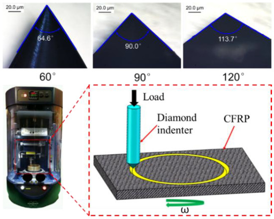 In order to reveal the cutting mechanism of dicing CFRP composites, the scratching experiments of CFRP composites with a diamond indenter were conducted on the UMT-TriboLab platform to compare the machined quality and cutting force with different fiber orientations and indenter angles, as shown in Figure 13. Three indenters with apical angles of 60°, 90°, and 120° were chosen to reflect the sharpness of diamond abrasive grits in the dicing blade. The sharpness of diamond indenters was well kept before the scratching experiment. Figure 14 shows the scratching force changing with the fiber orientations and the scratching load. Under the same load force, the indenter with apical angle of 60° generates the highest scratching force. The sharp tip allows it to indent into CFRP composites at a higher depth. More carbon fibers take part in scratching, so the scratching force is largest. The indenter with apical angle of 120° has a blunt point. It is different to indent into the CFRP. In most circumstances, it scratches on the surface of CFRP composites but does not cut the fibers. Thus, the scratching force is small. Besides, under the large indent force, the carbon fibers often break off instead of being cut off. Moreover, fiber orientations have remarkable impact on the scratching force. As seen from the figure, the scratching force increases with the increase of fiber orientation from 0° to 90° and then goes down with the increase of fiber orientation from 90° to 120°. When scratching direction is perpendicular to fiber orientation, the scratching force is largest, which is different from the trend of dicing CFRP composites with the diamond blade. It indicates the two cutting actions are of different machining mechanisms. The scratching mechanism is similar to the milling and drilling of CFRP composites.