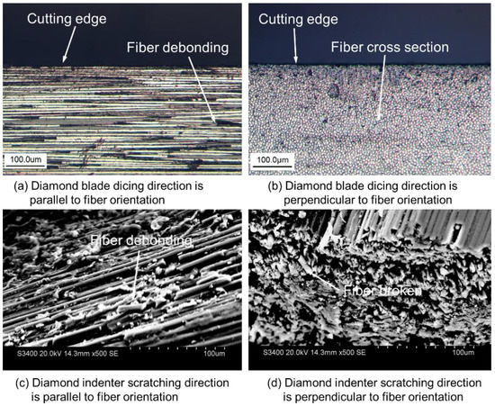 As shown in Figure 15, the comparisons between the morphologies of CFRP composites obtained with the dicing method and scratching identify that the dicing method with a diamond blade can provide much better surface quality of CFRP composites than traditional cutting. During the dicing process with a diamond blade, the carbon fibers were even cut along with its axis without breaking the carbon fibers. Only when the fiber orientation is not parallel to the dicing surface, the fibers will debond from the matrix under the cutting force of diamond grits. Thus, there are many debonding grooves left by carbon fibers, which is the main reason why the surface roughness is largest when the dicing direction is parallel to the fiber orientation. When the dicing direction is perpendicular to the fiber orientation as seen in Figure 15b, carbon fibers embedded well in the resin matrix are difficult to deform during the high-speed cutting process. Thus, carbon fibers are cut orderly. The surface roughness in this fiber direction is therefore best. In comparison with diamond blade dicing, the morphologies of CFRP composites obtained by the diamond indenter are much poorer, as presented in Figure 15c,d. Fiber bundles debonding or breaking are the main cutting mechanisms for diamond indenter scratching. This cutting style dominates that the surface roughness of machined CFRP composites is larger than the scales of carbon fibers.