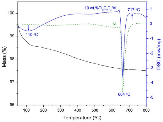 DSC analysis for 10 wt % Ti3C2/Al mixture in the temperature range 50–800 °C, together with Al for comparison.