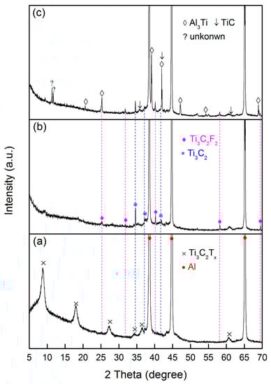 Figure 2 shows XRD patterns of 10 wt % Ti3C2Tx/Al samples before and after sintering at various temperatures. Before sintering, only Ti3C2Tx MXene and Al are detected, see Figure 2a. The broad peaks indicate the nanosheet structure of Ti3C2Tx. After sintering at 650 °C, some sharp diffraction peaks but with lower intensities appeared, in addition to the peaks corresponding to Al. These peaks are in good agreement with the simulated peaks for pure Ti3C2 and Ti3C2F2, see Figure 2b. It should be noted that the (002) peak at 8.7°, (004) peak at 17.98°, and (006) peak at 27.38° belonging to the Ti3C2Tx MXene disappeared in the XRD patterns of the sintered samples, see Figure 2b,c. The XRD results suggest that water molecules associated with the interlayer functional groups such as –O and –OH were gradually removed from 100 °C to 650 °C. The loss of water and functional groups causes a decrease in the basal space distance, or, alternatively, the newly formed surfaces possibly bond to form a new structure, which potentially induces the disappearance of basal peaks. The disappearance of basal plane peaks is similar to those for some layered compounds such as montmorillonite [48] and tetratitanate [49]. However, the diffractogram of the sample sintered at 700 °C shows the appearance of new phases of Al3Ti and TiC, indicating the occurrence of a reaction between Ti3C2Tx and Al at 700 °C. This result is in good agreement with the DSC analysis. Some weak peaks belonging to unreacted Ti3C2 and Ti3C2F2 can still be found. However, several peaks appearing in Figure 2c were not confirmed.