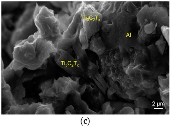 Figure 3 presents the morphologies of the raw Al and Ti3C2Tx powders and microstructures of the sintered samples. The raw Al particles are spherical, and each Ti3C2Tx particle has stacked multilayers, as shown in Figure 3a. After sintering at 650 °C, the polished surface shows that the Ti3C2Tx particles mainly distribute at the Al grain boundaries, see Figure 3b. No other new phases were detected in the sample sintered at 650 °C. The fracture surface clearly shows the stacked multilayers of Ti3C2Tx particles, see Figure 3c.