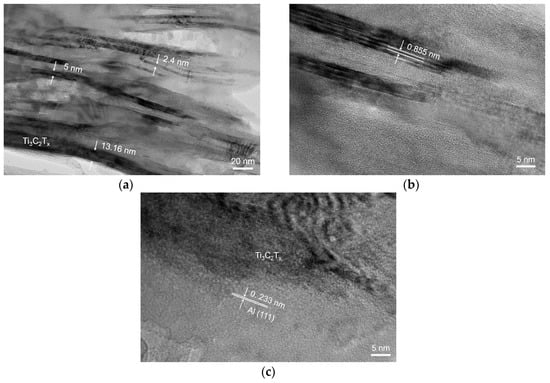 Figure 4a presents a TEM image of a multilayer Ti3C2Tx flake. The EDS line analysis, see Figure 4b, reveals the Al signal in the Ti3C2Tx flake, indicating the diffusion of Al atoms into the multilayers of Ti3C2Tx. The interlayer spacing areas of Ti3C2Tx provide active sites for Al nucleation and crystal growth. It should be noted that the F element was detected in the Ti3C2Tx multilayers, but O was mainly distributed in the areas between the Ti3C2Tx flake and Al grains. The presence of F in the multilayers suggests that the surface-layer termination of MXene is mostly F, i.e., Ti3C2F2. The –O group in Ti3C2Tx may react with Al to form Al2O3.