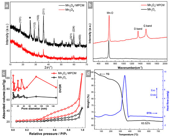 (a) XRD patterns, (b) Raman spectra, (c) nitrogen adsorption–desorption isotherms (inset shows pore size distributions) of Mn3O4/PCM and bulk Mn3O4, and (d) TG-DTA curves of the product.