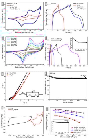 (a) Cyclic voltammetry (CV) curves at a scan rate of 80 mV·s−1; (b) galvanostatic charge–discharge (GCD) curves at 0.5 A·g−1 of Mn3O4/PCM and bare Mn3O4; (c) CV curves of Mn3O4/PCM at various scan rates; (d) GCD curves and specific capacitance at various current densities of Mn3O4/PCM (inset in d); (e) Nyquist plots of Mn3O4/PCM and bare Mn3O4; (f) capacitance retention of Mn3O4/PCM vs. cycle number at 1 A·g−1; (g) CV curves of Mn3O4/PCM and CAC at 20 mV·s−1; and (h) Ragone plots of asymmetrical supercapacitor in MnOx-based two-electrodes systems. CAC: commercial active carbon.