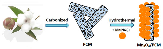 The preparation process of Mn3O4/PCM is schematically illustrated in Scheme 1. Dry cotton wool (Xinghua health cotton wool Co. LTD, Xinghua, China) was cut into short pieces and carbonized for 1 h at 350 °C under an argon atmosphere. The as-prepared sample is denoted as PCM. Then, 2.5 g PCM was immersed in 50 mL of 1 mol·L−1 Mn(NO3)2·6H2O solution. The dispersed solution was transferred to a 100 mL autoclave and reacted for 12 h at 180 °C. The hydrothermal reaction product was filtered, washed, dried, and annealed in a tubular furnace at 400 °C in air for 1 h, and the product was labeled as Mn3O4/PCM. For comparison, pristine Mn3O4 was hydrothermally synthesized by decomposing the solution of Mn(NO3)2·6H2O at 180 °C for 12 h without cotton.
