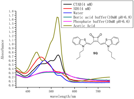 An important characteristic of squaraines is their tendency to form different patterns of aggregations, resulting in a dramatic color modulation [53,54]. We carried out the dilution experiments in some selected solvents (pure acetic acid and 4 mM SDS solution) by UV-Vis measurements to see if there were aggregations for SQ and the results were shown in supporting information (Figure S4a,b). It has shown that the absorption intensities decreased both in pure acetic acid and 4 mM SDS solution with the decrement of the SQ concentrations (10−4–10−6 M). The linear range of concentration of SQ in two different solvents was 1 μM to 10 μM by using the Beer–Lambert law. No absorption wavelength of SQ was shifted which suggest SQ was sensitive to the solvent environment but no aggregation can be concluded from the current data. The molar absorption coefficient of SQ in the linear range was not changed. A series of other solvents was applied in the UV-Vis measurements. Two microliters was extracted from 10 mM SQ stock solution and diluted with 198 μL corresponding solvent to get the total volume of 200 μL. The final concentration of SQ was 100 μM (100 times dilution). The absorption data for SQ in different solutions were summarized in Figure 1. SQ exhibited a maximum absorption wavelength at 475 nm in pure distilled water. While in boric acid buffer (10 mM, pH = 6.8) and phosphate buffer (10 mM, pH = 6.6), it gave a broad flat band in absorption range of 400 nm to 600 nm. Interestingly, it was found that in pure acetic acid, SQ showed two maximum absorption peaks individually at 430 nm and 525 nm. The addition of the cationic surfactant hexadecyl trimethyl ammonium bromide (CTAB) gave a relative broad absorption peak with maximum wavelength of 530 nm. SQ in anionic surfactant sodium dodecyl sulfonate (SDS) solution exhibited slight blue shift to 455 nm in the absorption spectra compared to that in the distilled water.