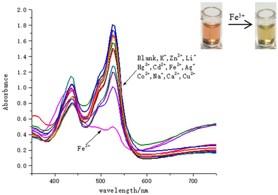 Development of selective and sensitive chemosensor materials for metal cation ions has attracted considerable attention owing to their key role and potential applications in chemistry, materials, and the environment [1,2,3,4,5,6,7,8,9,10,11]. Among heavy metals, iron is one of the essential elements playing an important function in a wide range of biological process, such as cellular metabolism, oxygen carrying, and regulation of enzyme reactions [12,13,14,15,16]. Meanwhile, mercury is considered a toxic element that has harmful effects on the human health and the environment. Accumulation of mercury in the body will cause severe health problem, especially damage of the central nervous system [17,18,19,20]. Therefore, a convenient and rapid method for the analysis of Fe3+ and Hg2+ is highly in demand. Current analytical techniques such as atomic absorption spectroscopy, inductively coupled plasma mass spectroscopy, and electrochemical analysis require sophisticated instruments and complex sample preparation procedures, which limit their wide applications [21,22,23,24,25]. It is imperative to develop simple material and effective methods for the detection of these ions. The use of a chemosensor material provides unique advantages in a view of sensitivity and response time. One strategy for the design of such molecules involves introducing an appropriate binding ligand to the chromophore in which optical responses are affected by the complexation process [26,27]. A serious of chromophore based materials has been developed, including squaraines, fluorescein, rhodamine, quinolones, porphyrins, coumarin, etc. [28,29,30,31,32,33,34]. However, design of a binding group which will be highly selective to each ion individually is not an easy proposition considered many ions share similar optical properties. Recently, another strategy for applying one single chemosensor material in simultaneous colorimetric detection of multiple metal ions has attracted great interests. The detection can be straightforward as long as the analysis shows differential responses to the metal ions. The strategy allows minimizing the multistep organic synthesis and accelerating the discovery process. A few examples have been reported to achieve multiple ion detections [35,36,37,38,39,40]. However, materials for dual detection of Fe3+ and Hg2+ are relatively rare. In this context, the design and synthesis of simple, facile, low cost colorimetric material for selectively recognition of Fe3+ and Hg2+ remains a challenge.