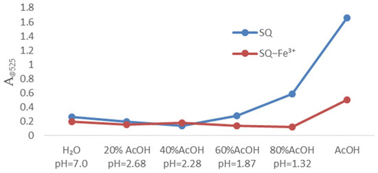 To evaluate the sensing properties of SQ (final concentration: 100 μM) towards metal ions, the UV-Vis spectral changes were investigated with addition of various metal ions including Na+, K+, Li+, Ag+, Zn2+, Hg2+, Cd2+, Fe2+, Co2+, Ca2+, Fe3+ (final concentration: 100 μM) in pure acetic acid. As shown in Figure 2, there were no significant spectral changes in the presence of most metal ions, whereas Fe3+ caused the distinct spectral changes with absorption intensity decreased in 525 nm. And Fe3+ pronounced color changes from orange to cream yellow by direct visualization. The water effect on detection of Fe3+ for SQ in AcOH-H2O solutions was further evaluated (Figure 3). There were gradually decreased absorption bands at 525 nm of SQ with increasing portion of water in acetic acid. The pH effect on the selectivity of SQ for Fe3+ has been observed as well. With increasing amount of AcOH in solution, the pH decreased gradually but the absorption intensity of SQ itself dramatically enhanced. In addition, only a distinct difference in absorption bands was observed in pure acetic acid for SQ with or without addition of Fe3+. We have also monitored the absorption changes of SQ in pure acetic acid and after 24 h, there were no significant changes in view of UV-Vis spectral (Figure S5a). In addition, 1HMR spectrum of SQ in CD2Cl2 after 24 h (Figure S5b) shown with no decomposition preliminarily revealed its stability in this condition. All these results indicated that SQ can be a good probe for detecting Fe3+.