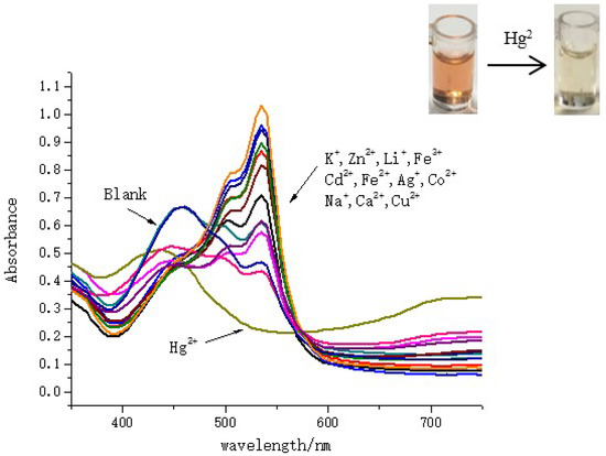 Another interesting phenomenon was discovered in the detection of Hg2+ in SDS surfactant solutions. As shown in Figure 4, when various metal ions were added into SQ solutions in presence of 4 mM SDS, the single absorption band of SQ at 455 nm (maximum absorption wavelength without metal ions) was red shift to 535 nm except for Hg2+. Upon addition of Hg2+, the absorption band at 535 nm decreased gradually, while the absorption in the range of 650 nm to 750 nm increased with one clear isosbestic point, which indicating the binding between SQ and Hg2+ afforded only one species. This new peak might be ascribed to a metal-to-ligand charge transfer [55,56].