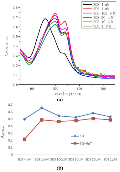 To evaluate the SDS effect on the Hg2+ detection, wide concentrations (1 μM–4 mM) of SDS solutions were adopted in Figure 5a. It was shown that when SDS concentration reached at 4 mM which was higher than critical micelle concentration (CMC) of SDS, the maximum absorption wavelength of SQ without metal ions exhibited a blue shift to 455 nm. It was found that the relative changes of SQ absorption intensity in 4 mM SDS micellar solution at 535 nm discriminate the most compared to that in other concentrations in the case of Hg2+ detection (Figure 5b). The solution of SQ in 4 mM SDS displayed an orange color, and the addition of Hg2+ caused an instant vivid color change from orange to grain yellow. The difference in color response allowed SQ to easily distinguish between Fe3+ and Hg2+ in aqueous solution.