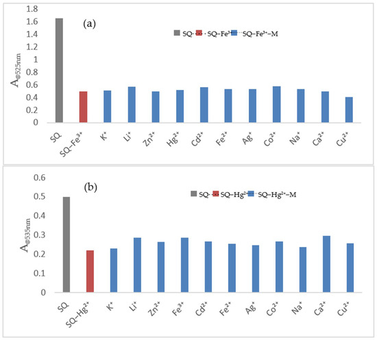 To validate the selectivity for Fe3+ and Hg2+, respectively, the competition experiments have also been performed. Other different ions as interferences were added to the mixture of SQ–Fe3+ or SQ–Hg2+ solution. The final concentration of other cations (100 μM) was 5 times more than that of Fe3+ (20 μM) and Hg2+ (20 μM) in the SQ solution. As shown in Figure 6a,b, there were no significant influences on Fe3+ and Hg2+ detections even extra amounts of other ions were added into the SQ–Fe3+ and SQ–Hg2+ system. All these findings suggest SQ exhibit high selectivity for Fe3+ and Hg2+ compared to other metal ions and it could be used as a colorimetric chemosensor for dual analytes analysis.