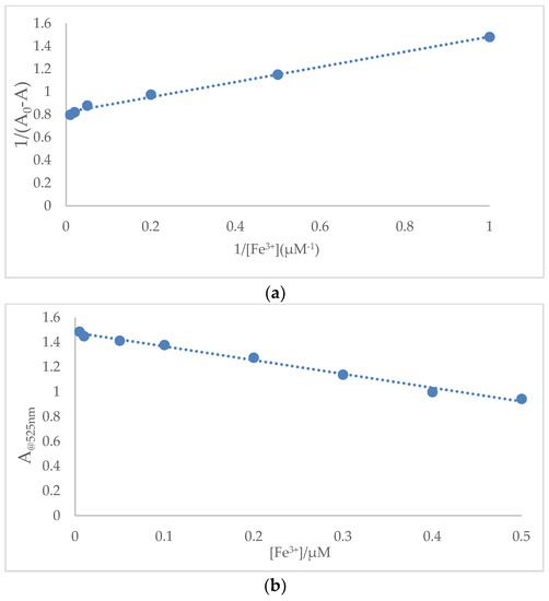 (a) Benesi-Hildebrand plot analysis of the absorption changes for the complexation between SQ and Fe3+, R2 = 0.9936. (b) Plot of absorption intensity change of SQ (100 μM) against concentrations of Fe3+ from 0.01 μM to 0.5 μM. R2 = 0.9907.