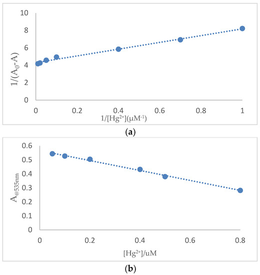(a) Benesi-Hildebrand plot analysis of the absorption changes for the complexation between SQ and Hg2+, R2 = 0.9907. (b) Plot of absorption intensity change of SQ (100 μM) against concentrations of Hg2+ from 0.05 μM to 0.8 μM. R2 = 0.9948.