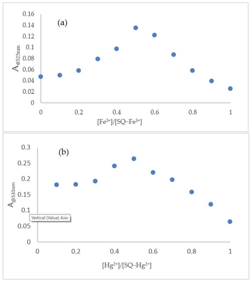 (a) Job’s plot for the complexation of SQ with Fe3+ in AcOH solution; (b) Job’s plot for the complexation of SQ with Hg2+ in SDS (4 mM).