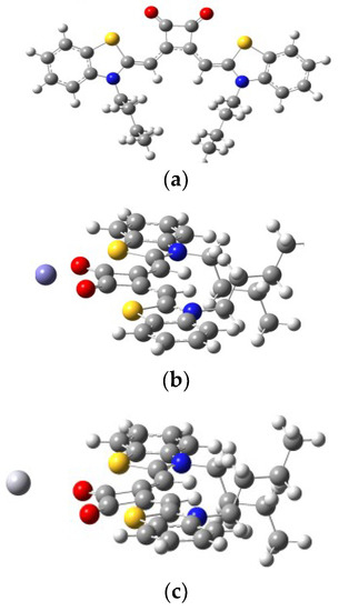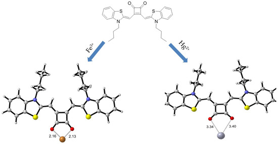 Theoretical calculations have been explored as well to understand the nature of the binding of SQ–Fe3+ and SQ–Hg2+ complexes. All calculations were carried out with the Gaussian 09 package [65]. The density functional theory (DFT) hybrid model with the B3LYP was used for the gas-phase geometry optimization, Lanl2dz basis set with effective core potential (ECP) for Fe and Hg, and the 6-31G(d) basis set was used for all remaining atoms. Based on the calculations, the favorable binding modes between Fe3+ and its Hg2+ complexes were depicted in Figure 11a–c. According to the calculations, the geometry optimized structure of SQ–Fe3+ complex (Figure 11b) was illustrated the same as our proposed. It showed lower energy when Fe3+ was bind two carbonyl groups in squarely moiety. However, the simulated spectra are in good agreement with the proposed complexation mechanism for only SQ–Fe3+ complexes. For SQ–Hg2+ complex, the Hg atom was far away from the SQ.