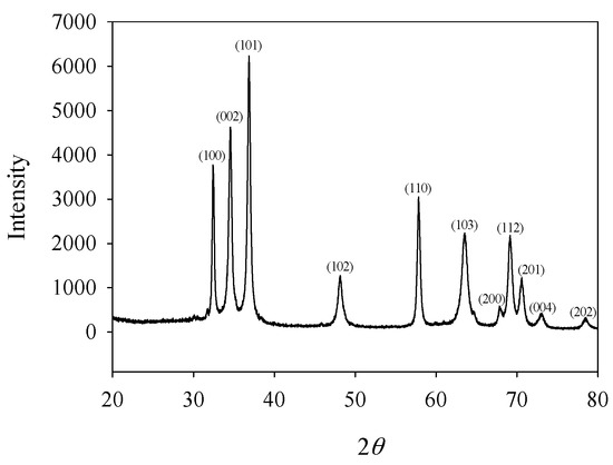 The material that is used in this work is GaN, which is a new kind of electronic ceramics materials with piezoelectric and semiconductor properties. Due to the stable conductivity and excellent functional properties, GaN is a perfect candidate material of electromechanical, high-power and high-frequency devices for operation in extreme environments [25,26,27,28]. Here, GaN ceramics were manufactured from pure GaN powder by vacuum hot pressing at 450 °C (with a density of 5.9 relative to water), which exhibits properties similar to that of N-type semiconductors with a Curie temperature of 265 °C. It is seen from Figure 1 that the X-ray diffraction pattern matches well with the standard spectrum of JCPDS file (i.e., No. 76-0703) of GaN.