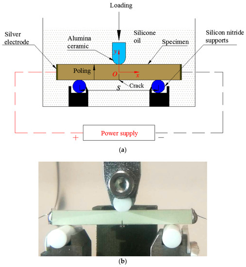 As shown in Figure 3, a multi-field three-point bending fracture system was constructed with the span s = 30.0 mm. While considering insulation requirements during mechanical loading, the loading head and supports were made of alumina ceramic and silicon nitride ceramic, respectively. In addition, all the jigs were fixed in a plexiglass container that was filled using silicone oil to prevent electrical sparking. Both ends of a sample length were plated with silver, a viscous emulsion that solidified quickly at 200 °C, to act as electrodes. Then, silver wires were welded at the left and right sides of a sample using an electric iron to connect the power supply.