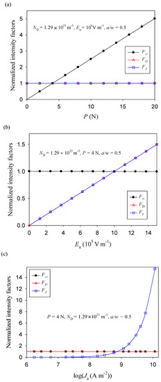 As shown in Figure 5, the stress intensity factor is solely related to the applied mechanical load, the electric displacement intensity factor is only connected with the applied electric field strength, and the electric current intensity factor is just dependent on the applied electric current and the accompanying electric field. This is because the polarization direction of a specimen is oriented along the y-axis, and thus it is perpendicular to the direction of an applied electric field (in the x-direction), which is uncoupled with the stress component σxx (see Equation (2a)). Therefore, the electric load has no effect on the stress intensity factor. Similarly, due to the polarization direction along the y-axis, the piezoelectric charge moves in the y-axis direction under the applied mechanical load (piezoelectric-semiconductive effect). The electric current density in the x-direction (Jx) and the electric displacement in the x-direction (Dx) are not affected by the mechanical load (see Figure 5).