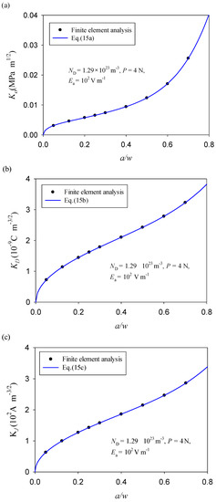With reference to the standard form (ISO15732:2003) [29], the formulas of intensity factors were fitted by using the numerical results for specimens with a single-edge crack, ranging from 1.43 mm to 2 mm. As shown in Figure 6, no matter how the crack length changes (a/w), the the stress intensity factor, Kσ, the electric displacement intensity factor, KD, and the electric current intensity factor, and KJ, conform to a unique fitting function (see Figure 6a–c), that is