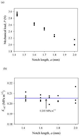 As shown in Figure 7a, the critical load at fracture decreases linearly as the crack length increases under a purely mechanical load. Based on critical loads and Equation (15a), the critical stress intensity factors were calculated and are shown in Figure 7b. It is seen that the critical stress intensity factor (fracture toughness) is Kσ,C = 0.205 ± 0.011 MPa m1/2, which is obviously lower than fracture toughness of insulating piezoelectric ceramics (around 1 MPa m1/2) [41,42,43]. As is well known, fracture toughness is a material property that can serve as a fracture criterion. Thus, we need to further investigate fracture under combined mechanical and electrical loading and verify the influence of electric current on the fracture behavior of conductive PSCs.
