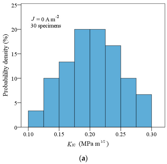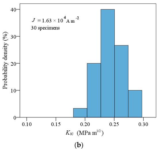 It is seen from Figure 8 that, as the applied electric current density increases from 0 to 1.63 × 104 A m−2, the mean value of the critical stress intensity factor increases from 0.19 to 0.26 MPa m1/2, and thus fracture toughness increases by 36.8%. However, as the applied electric current further increases, fracture toughness decreases. Under an applied electric current, the corresponding fracture toughness distributions can be completely changed (see Figure 9). That is, the fracture behavior of PSCs is significantly influenced by an electric current. Therefore, under combined mechanical and electric loading, electric current should be introduced in the fracture criteria for PSCs with a single-edge crack.