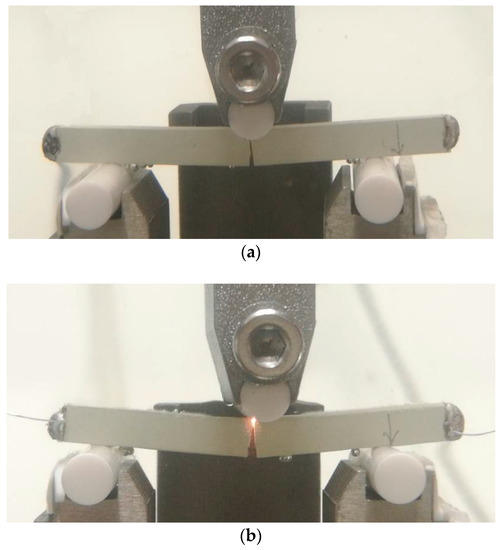 Specimens in fracture testing (a) without an applied electric current and (b) under the combined electrical and mechanical loading (1.63 × 104 A m−2).