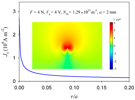 The electric current density distribution in the extension of a crack tip (see Figure 2) and the corresponding nephogram near the crack tip.