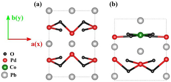Figure 1 shows the relaxed crystal structures of PbPdO2 and PbPd0.75Co0.25O2 ultrathin slabs with (002) preferred orientation. As shown in Figure 1, the unstrained PbPdO2 and ultrathin slab revealed an in-plane symmetric configuration, maintaining the important properties of PbPdO2. After Co-doping, the symmetric configuration of PbPd0.75Co0.25O2 was broken. In comparison to the pristine PbPdO2, the broken-symmetry in PbPd0.75Co0.25O2 was expected to bring different physical properties. It should be noted that the anisotropy of PbPd0.75Co0.25O2 was greatly affected by the state of the Co-substitution. Moreover, its configurations were fairly complicated. Here, the configuration with the least number of atoms and only one Co doping atom was considered, as seen in Figure 1b. Specifically, this Co atom forms square planar bonding with the nearest-neighbor four O atoms, which plays an important role on the electrical properties of PbPd0.75Co0.25O2.