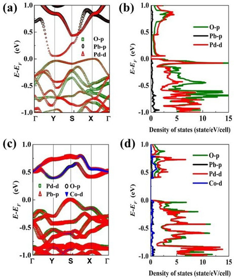 Figure 2a–d shows the calculated electronic structures and the partial densities of states of Pb, Pd, O, and Co in PbPdO2 and PbPd0.75Co0.25O2 slabs, respectively. It was found that PbPdO2 exhibits intrinsic characteristics of narrow band gap (0.051 eV), which was much smaller than that (0.4 eV) of the PbPd0.75Co0.25O2 slab. In our previous experimental work, PbPdO2 with (002) preferred orientation was prepared, and its band gap was found to be close to zero [22]. It is suggested that the localized Co would be responsible for the large band gap of 0.35 eV for the PbPd0.75Co0.25O2 bulk material. Interestingly, our calculated results were consistent with the reported results [23]. The band gap of PbPdO2 slab was slightly larger than that reported in our previous calculated work because of the different full in-plane structure relaxation [14]. From the density of electronic states in Figure 2b,d, it is found that DOSs of the pristine and Co-doped PbPdO2 slabs at minimum of the conduction band and maximum of the valence band were mainly composed of 4d(Pd) and 2p(O) states. These results were similar to those found by many research groups [6,10]. In contrast, the PbPd0.75Co0.25O2 slab had more distinct contribution of hybridization of 2p(O)–4d(Pd) states, where a Co 3d state added modified energy to the DOS at the Fermi energy level.