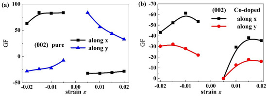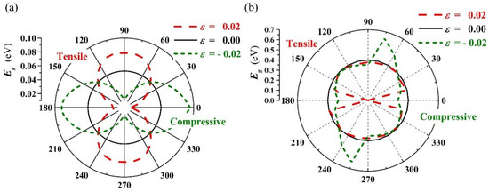 Figure 4a,b shows the orientation distribution curves of band gap with = −0.02, 0.00, 0.02 for the PbPdO2 and PbPd0.75Co0.25O2 slabs, respectively. It is clear that both slabs show a distinct anisotropy of gap with different strain. In Figure 4a, the PbPdO2 slab shows the symmetrical and peanut-like curves, and having the largest and smallest band-gap values along the x axis () or y axis (), respectively. In contrast, as shown in Figure 4b, the PbPd0.75Co0.25O2 slab has a maximum gap for the strain = −0.02 at about and a minimum gap for the strain = 0.02 at about .