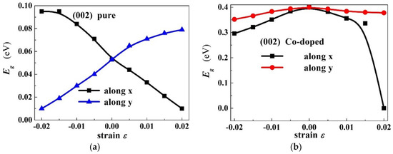 Figure 5a,b shows the band gap as a function of the strain for PbPdO2 and PbPd0.75Co0.25O2 along x axis () and y axis (), respectively. As shown in Figure 5a, it is found that the band-gap value increases with increasing strain along the y-axis, whilst the band-gap value decreases with increasing strain along the x-axis. It is interesting that the band gap of the PbPdO2 slab would widen when a compressive stress is applied closely to the x-axis or a tensile stress is applied closely to the y-axis, as seen in Figure 4a. These calculated results can be explained according to the interaction of Pd–O bonding. It is expected that a compressive stress along the x-axis or tensile stress along the y-axis pulls O atoms apart from Pd atoms, which weakens the interaction of Pd and O. On the other hand, a tensile stress along the x-axis or compressive stress along the y-axis would push O atoms closely to Pd atoms and strengthen the interaction of Pd and O. As a result, the band gap is decreased. A similar result has also been reported in MoS2 and black phosphorus [25,26].