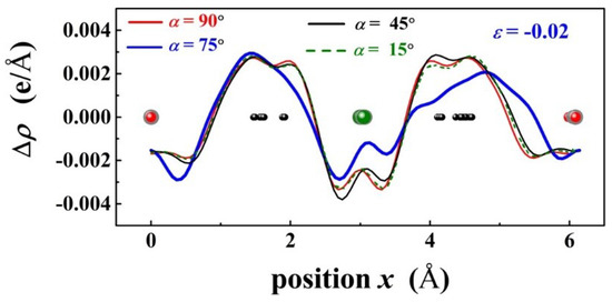 Figure 6 shows the plane averaged electron density difference Δρ of PbPd0.75Co0.25O2 projected along the x axis and under = −0.02, with α = 15°, 45°, 75°, and 90°, respectively. In comparison, it is found that p-d charge transfer Δρ between Co and O exhibits an evident change for α = 75°. Therefore, the band gap of PbPd0.75Co0.25O2 is expected to be changed significantly as the compressive stress direction is along a particular direction with α = 75°. Figure 7 shows the plane averaged electron density difference of PbPd0.75Co0.25O2 projected along the x axis under = −0.02, −0.01, 0.00, 0.01, 0.02, respectively. Based on spin-splitting theory, the minimum gap of the PbPd0.75Co0.25O2 slab with the strain = 0.02 is strongly related to the variation of . From Figure 7, it is concluded that Co atom should act as the source of the localized magnetic moment, and the coupling between the p-state from O and d-state from Co could induce a strong exchange interaction (named as p-d exchange interaction) in PbPd0.75Co0.25O2. Moreover, the p-d exchange interaction was found to be nearly inversely proportional to the unit cell volume [27]. Therefore, p-d exchange interaction mediated by strain should be responsible for variation of the plane averaged electron density difference, leading to a clear change of the band gap.