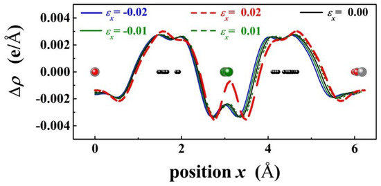 The plane averaged electron density difference of PbPd0.75Co0.25O2 under = −0.02, −0.01, 0.00, 0.01, 0.02, where the projection of was along the x axis.