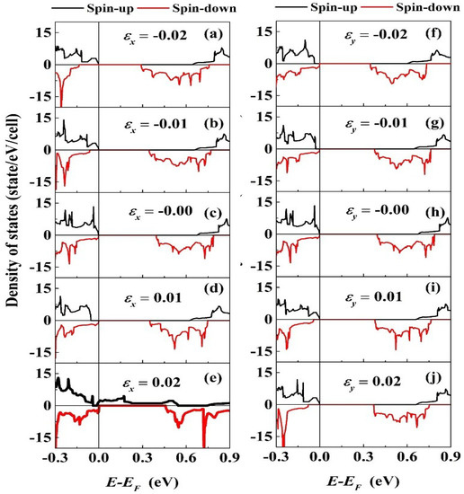 Figure 8 shows the spin polarized total density states of the PbPd0.75Co0.25O2 slab with different strain along the x and y-axes external uniaxial strain directions. From the figure, it is found that the spin-up and spin-down DOSs are asymmetric, which means the existence of magnetic moment. The magnetic properties in element doped PbPdO2 will be studied in subsequent research work. Interestingly, as shown in Figure 8e, the tensile strain with = 0.02 leads to the zero-band gap structure. The strain gives rise to the evident left shift of the bottom of the conduction band in spin-down DOSs, which effectively modulates the band gap. When the strain is large enough, the top of the valence band and the bottom of the conduction band in spin-up and spin-down DOSs all shift with changing strain, which leads to clear modulation of the band gap. This interesting phenomenon is similar to the fact that the slight tensile strain results in the zero-band gap structure [4].