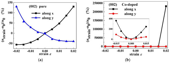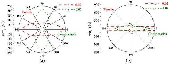 Combined with the results presented in Figure 4a,b, the external strain dependence of charge carrier concentration ratio () for PbPdO2 and PbPd0.75Co0.25O2 slabs were evaluated, respectively. Figure 9a,b shows the orientation distribution curves of the intrinsic charge carrier concentration ratio for PbPdO2 and PbPd0.75Co0.25O2 slabs with = −0.02, −0.01, 0.00, 0.01, 0.02, respectively. Similar to the dependence of band gap on strain orientation, PbPd0.75Co0.25O2 exhibits more distinct anisotropy in carrier concentration with strain direction, especially along the x-axis. As shown in Figure 9a, the pristine PbPdO2 slab demonstrates the symmetrical and olive-like curves, and having its largest and smallest band-gap values along the x-axis or y-axis, respectively. For the PbPd0.75Co0.25O2 slab, the carrier concentration is sensitive to the application direction of strain. When the compressive stress applies along a direction of 75° () and x-axis, the remarkable variety in carrier concentration appears, as shown in Figure 9b. Figure 10c,d shows the intrinsic charge carrier concentration ratio as a function of strain for PbPdO2 and PbPd0.75Co0.25O2 slabs along the x and y-axes, respectively. For the PbPdO2 slab, the carrier concentration increases monotonically with increasing compressive stress, but decreasing with increasing tensile stress along the x-axis. On the contrary, the carrier concentration decreases with increasing compressive stress, while increasing with increasing tensile stress along the y-axis. In contrast, the carrier concentration of PbPd0.75Co0.25O2 slab increases with increasing compressive and tensile stresses along both the x and y-axes. As the compressive stress increases beyond 0.015 along the x-axis, carrier concentration of the PbPd0.75Co0.25O2 slab increases rapidly. It was found that the carrier concentration of PbPd0.75Co0.25O2 could sharply increase up to 5–6 orders of magnitude with the help of external strain with = 0.02. The calculated results suggest strongly that the element-doping PbPdO2 should become an important piezoresistance candidate material.