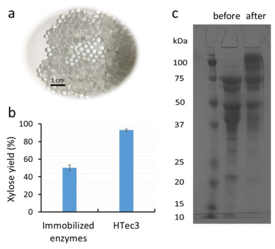 (a) Alginate beads activated with glutaraldehyde (3%, w/w) for enzyme immobilization; (b) the xylose yield of xylooligomer-enriched pre-treatment liquors after 24 h hydrolysis using either immobilized HTec3 (xylanases) or non-immobilized HTec3; and (c) SDS-PAGE of the HTec3 enzymes remaining in solution before (left column) and after immobilization (right column).
