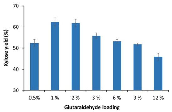 Previous work has shown that enzyme immobilization efficacy can be significantly enhanced by optimizing the glutaraldehyde dose used for alginate bead activation [8,9,10]. Therefore, to try to improve the immobilization efficiency, various glutaraldehyde loading concentrations (0.5–12%) were assessed during the activation of the alginate beads. Enzyme immobilization was carried out after alginate bead activation and the immobilized enzymes were then used to hydrolyze the xylooligomer-enriched pre-treatment-derived liquid. It was apparent that the highest hydrolysis yields were achieved with the alginate beads that were activated with 1% glutaraldehyde, as about 65% of the xylooligomers could be hydrolyzed to xylose after 24 h hydrolysis (Figure 2). However, over the range of glutaraldehyde loading concentrations assessed, most of the β-xylosidases still did not bind to the alginate beads (data not shown). It was apparent that glutaraldehyde loading concentration could be reduced three-fold (from 3% to 1% glutaraldehyde) [7] with increased immobilization efficacy (Figure 2) as compared to the published protocol for immobilization of a purified xylanase from Aspergillus niger by Pal and Khanum (2011) [9]. The conditions that were found to be optimal for HTec3 immobilization on alginate beads were slightly different from previous studies. This was likely due to several factors, such as the HTec3 preparation containing multiple enzymes, the xylanases in HTec3 belonging to different glycoside hydrolase families and the non-enzyme components in HTec3 interfering with the surface immobilization process.