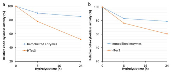 One of the advantages of enzyme immobilization is to improve enzyme thermostability during the time course of enzymatic hydrolysis [20,21]. Further analysis of the major enzymatic activities of immobilized xylanases (endo-xylanase and β-xylosidase activities) revealed that they retained approximately 90% and 85% of their endo-xylanase and beta-xylosidase activities, respectively, after 24 h incubation at enzymatic hydrolysis conditions (50 °C in 50 mM sodium acetate buffer) (Figure 3a,b). In contrast, the original commercial enzyme preparation HTec3 only retained about 50% and 60% of its endo-xylanase and beta-xylosidase activities, respectively, after 24 h incubation under the same conditions (Figure 3a,b).
